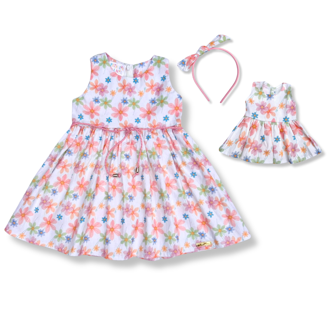 Kit Vestido Infantil + Vestido da Boneca - Branco Flores